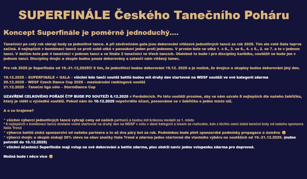 Věříme, že ČSTS pro Vás připravila výborný systém soutěží a super zábavu. Snad dokážeme přispět ke kvalitě českého tancování a připravíme pro vás zajímavou show